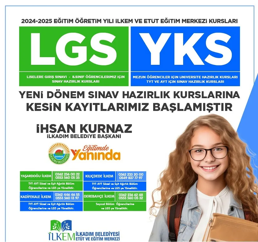 İLKEM bünyesinde açılacak LGS ve YKS kurslarının eğitimde fırsat eşitliğine destek verdiğini ifade eden İlkadım Belediye Başkanı İhsan Kurnaz, “Gençlerimiz, geleceklerini belirleme noktasında bazı önemli eşiklerden geçiyorlar. Öğrencilerimize ve ailelerine bu eşiklerden geçerken destek olma noktasında, İLKEM bünyesinde LGS ve YKS hazırlık kursları açıyoruz. Belirlenen tarihlerde başlayacak olan kurslarımız için kesin kayıt süreci devam ediyor. LGS’ye hazırlanan ve okul derslerine katkı sağlamak isteyen öğrencilerimiz için LGS hazırlık kurslarımız, 14 Eylül 2024 Cumartesi günü başlayacak ve kayıtları 13 Eylül 2024 Cuma günü sona erecek. Üniversite hayalleri kuran mezun gençlerimize yönelik YKS hazırlık kurslarımızın da kesin kayıt süreci devam ediyor. 24 Eylül 2024 Salı günü başlayacak kurslarımızda, son kayıt tarihi de yine 24 Eylül 2024 olarak belirlendi. Gençlerimizin gelecek hayallerine, ailelerine ve eğitime katkımız devam edecek” dedi.