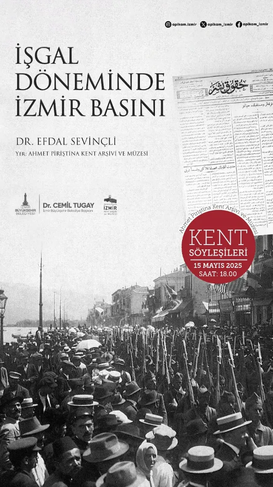İzmir Büyükşehir Belediyesi Ahmet Piriştina Kent Arşivi ve Müzesi’nde (APİKAM) devam eden “Kent Söyleşileri” kapsamında 15 Mayıs 1919’da başlayan ve 9 Eylül 1922’de son bulan işgal yılları boyunca İzmir’de basın hayatının durumu mercek altına alınacak. Dr. Efdal Sevinçli’nin konuşmacı olarak katılacağı “İşgal Döneminde İzmir Basını” söyleşisi, 15 Mayıs Perşembe günü ziyaretçilerini bekliyor.