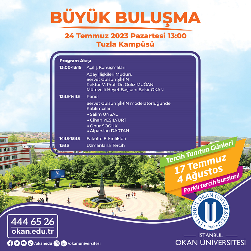 İstanbul Okan Üniversitesi Tuzla Kampüsü’nde 24 Temmuz 2023 Pazartesi günü saat 13.00’te düzenlenecek Büyük Buluşma’da rektör, rektör yardımcıları, dekanlar ve akademisyenler üniversite adaylarıyla bir araya gelecek. Adaylar tercih edecekleri bölümler hakkında bilgi alacak.