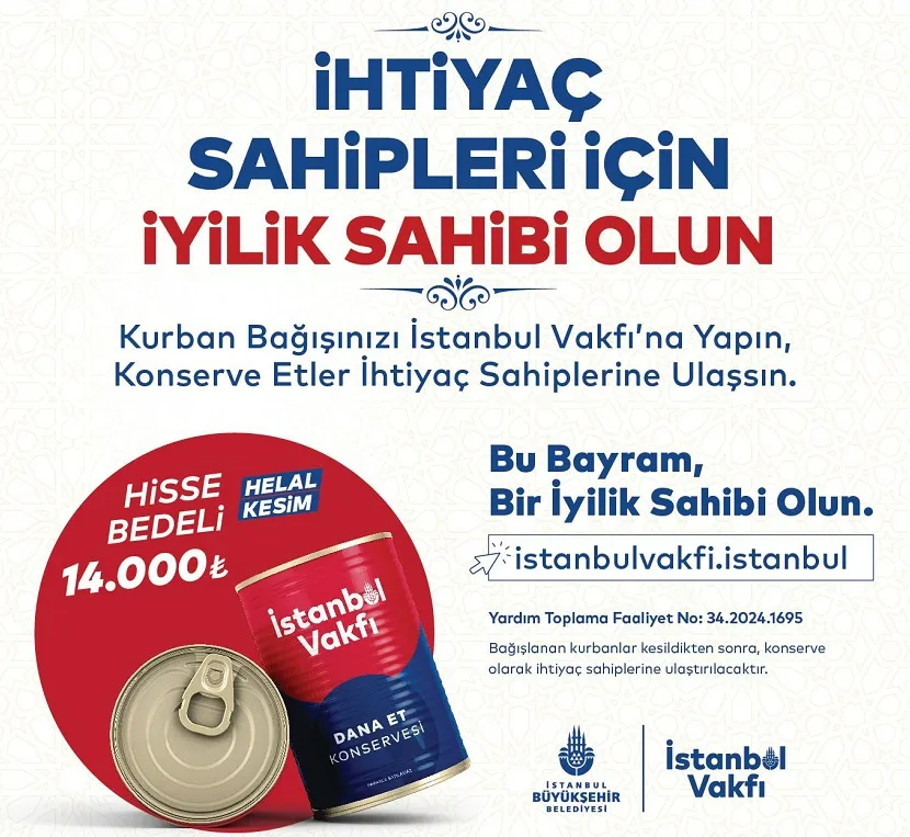 İBB İstanbul Vakfı’nın her yıl düzenlediği Kurban Bağışı Kampanyası başladı. Hijyenik ortamlarda İslami usullere göre kesilen kurbanlar, konserve yapılarak ihtiyaç sahiplerine ulaştırılıyor. İstanbul Valiliği’nin yardım toplama iznine istinaden başlatılan kampanyada kurban hisse bedeli bu yıl 14 bin TL oldu. Bağışlar istanbulvakfi.istanbul adresinden yapılıyor.