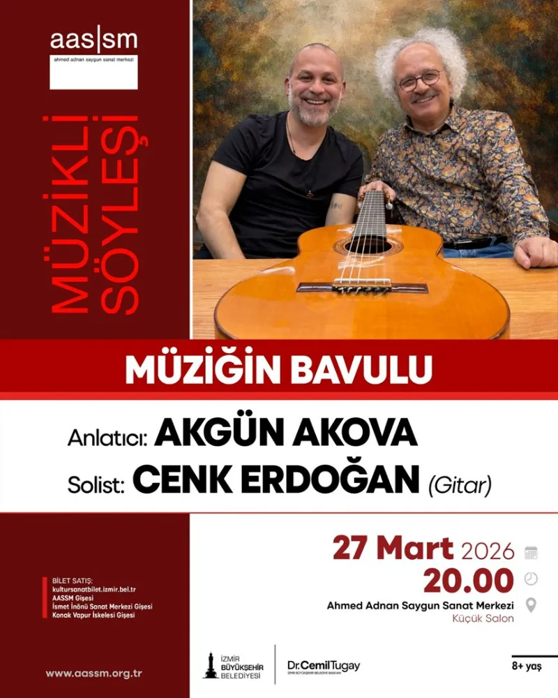Sanatın hikâyesini sahneye taşıyan “Müziğin Bavulu” müzikli söyleşi, 27 Mart Cuma saat 20.00’de yapılacak. Gitar sanatçısı Cenk Erdoğan ile şair, fotoğraf sanatçısı ve gezgin Akgün Akova’nın buluştuğu söyleşi, müzik ve edebiyatın iç içe geçtiği özel bir sahne deneyimi sunacak.