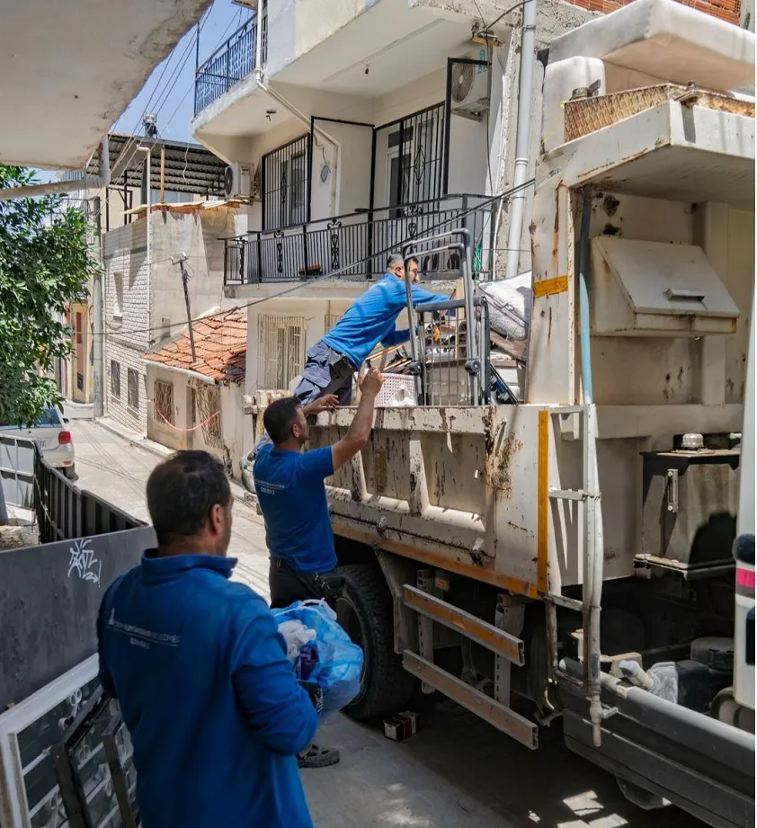 İzmir Büyükşehir Belediyesi, Buca Onat Tüneli inşaatı sırasında evi zarar gören aileyi, Karabağlar Uzundere’deki konutlara taşıdı. Aile 12 ay boyunca burada kira ödemeden oturabilecek.