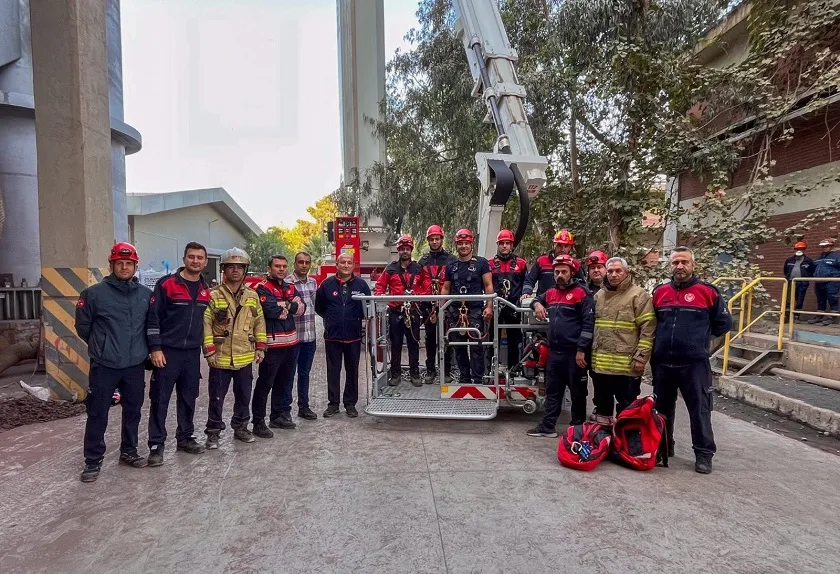 Bornova’da Ankara Caddesi üzerinde bulunan bir çimento fabrikasına ait 70 metre yüksekliğindeki bacaya temizlik amacıyla çıkan 2 işçi, iskelenin çökmesi sonucu yaklaşık 10 metre aşağıya düşerek baca içerisinde mahsur kaldı. Olayın ihbar edilmesi üzerine bölgeye İzmir Büyükşehir Belediyesi İtfaiye Dairesi Başkanlığı ve AFAD ekipleri sevk edildi. Ekipler, 90 metrelik merdivenli araçla bacanın üst kısımlarına doğru çıkarak işçilere ulaştı. Ekipler, yaklaşık dört saatlik titiz ve kontrollü çalışmaların ardından işçileri mahsur kaldıkları yerden kurardı. Sağlık durumlarının iyi olduğu belirlenen işçiler, tedbir amacıyla 112 Acil Sağlık ekiplerine teslim edildi.