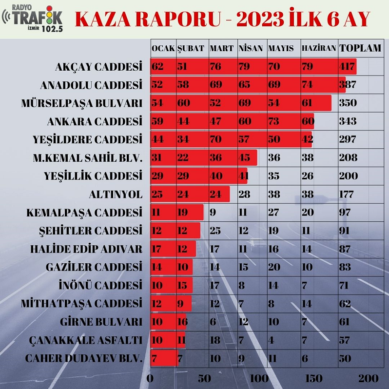 RADYO TRAFİK İZMİR ÖZEL HABER / Radyo Trafik İzmir haber merkezine ulaşan bilgiler ve Radyo Trafik Yolda verilerine göre İzmir’de, 2023 yılında geride kalan 6 ayda kent genelindeki ana yollarda trafiği etkileyen 5 bin 269 trafik kazası meydana geldi. Çevre yolları yine en çok kazanın yaşandığı bölgeydi. Yılın ilk yarısında Akçay Caddesi’nde 417 kaza olurken, Hilal Köprüsü 127 kaza ile 2023'ün ilk 6 ayının en kara noktası oldu.