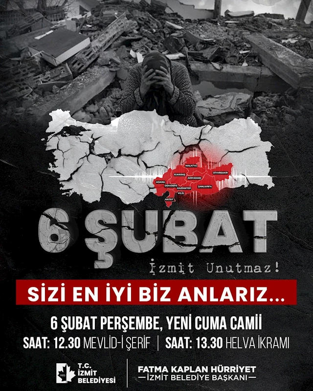Kahramanmaraş merkezli 6 Şubat depremlerinin yıl dönümünde İzmit Belediyesi, yaşamını yitirenler anısına yarın Yeni Cuma Cami’inde Mevlid-i Şerif okutacak. Öğle namazı sonrasında ise vefat eden vatandaşlarımız için helva ikramında bulunacak.