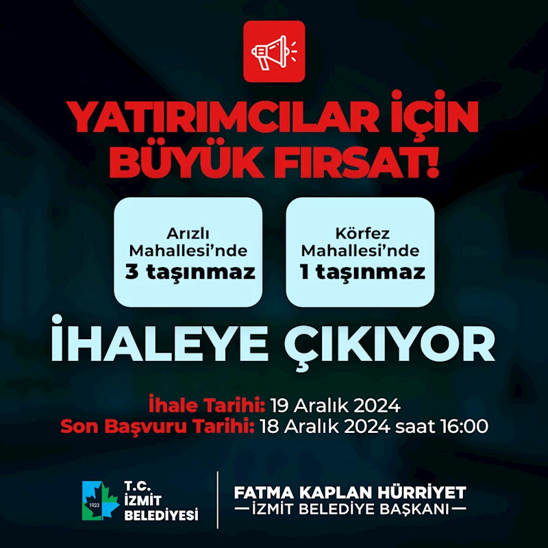 İzmit Belediyesi, yatırımcılar için önemli bir fırsat sunuyor. Arızlı Mahallesi ve Körfez Mahallesi’nde bulunan 4 taşınmaz, 19 Aralık’ta düzenlenecek ihale ile satışa sunulacak