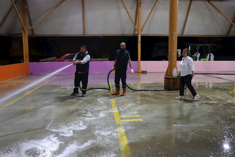 İzmit Belediyesi Temizlik İşleri Müdürlüğü, Kurban Bayramı öncesi dün gece saatlerinde Yeşilova Kapalı Pazar Alanı’nda temizlik ve dezenfekte çalışması gerçekleştirdi