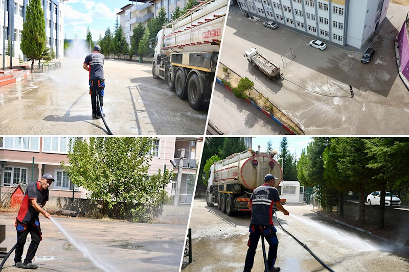 Yaz boyunca cadde ve sokaklarda sürdürülen yıkama uygulamalarını okullara taşıyan ekiplerimiz, okul bahçelerini temizleyerek yeni döneme hazır hale getirdi. Çalışmalar, öğrencilerin daha hijyenik ve güvenli alanlarda eğitim görmesini sağlamak amacıyla düzenli olarak devam edecek.
