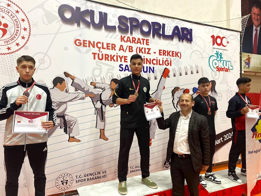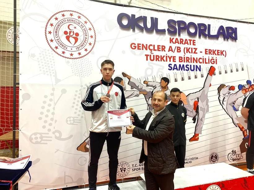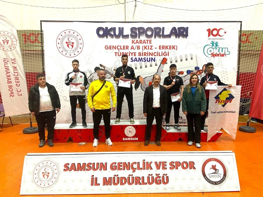 SAMSUN-Gençlik ve Spor Bakanlığı'nın düzenlediği Karate Türkiye Birinciliği Samsun'da devam ediyor. 50 il, 362 okul, 429 sporcu. Bugün erkekler müsabakaları yapıldı. Dereceye giren sporculara madalyaları Samsun İl Müdürümüz Feyzullah Dereci takdim etti.