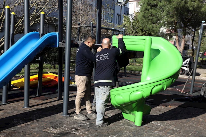 Yanarak tamamen kullanılmaz hale gelen kauçuk zemin ve oyun gruplarına Eyüpsultan Belediyesi ekipleri tarafından vakit kaybetmeden müdahale edildi.