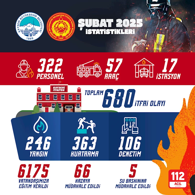 Kayseri başta olmak üzere ihtiyaç duyulan her noktada yangından trafik kazasına, doğal afetlerden arama kurtarma çalışmalarına, su baskınından denetim ve eğitim çalışmalarına kadar birçok konuda fedakârca görev üstelenen Büyükşehir Belediyesi İtfaiye Daire Başkanlığı ekipleri, Şubat ayında toplam 680 itfai olaya müdahale etti.