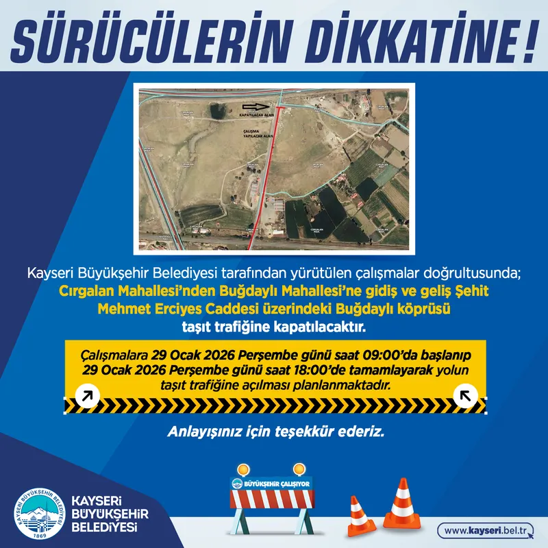 Cırgalan Mahallesi'nden Buğdaylı Mahallesi'ne gidiş ve gelişin sağlandığı Şehit Mehmet Erciyes Caddesi üzerindeki Buğdaylı köprüsü, taşıt trafiğine kapatılacak.