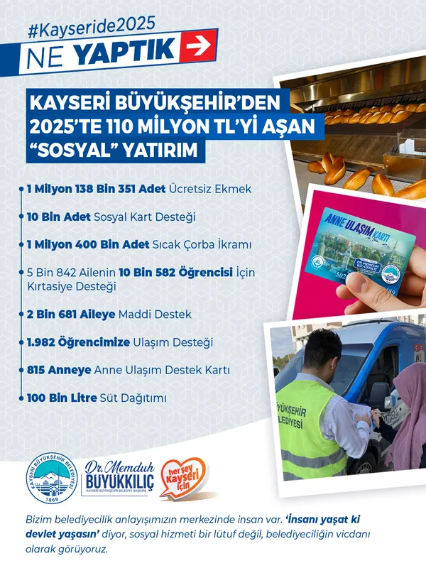 Kayseri Büyükşehir Belediyesi, 2025 yılında sosyal destek ve yardım hizmetleri için 110 milyon TL'yi aşan bir kaynağı vatandaşların hizmetine sundu. Sosyal Hizmetler Daire Başkanlığı aracılığıyla yürütülen hizmetler, ekmekten eğitime, ulaşımdan gıdaya, öğrenci ve aile desteklerinden anne ve çocuk projelerine kadar uzanan geniş bir yelpazeyi kapsadı.