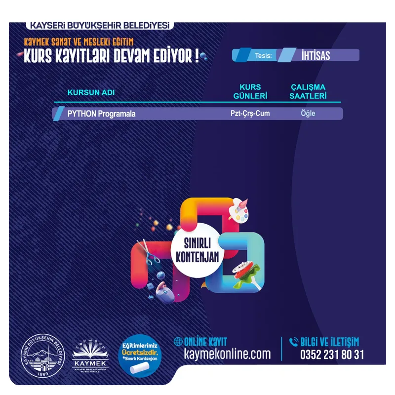 Python Programlama Kursu'na kayıtlar için dersler Pazartesi, Çarşamba ve Cuma günleri düzenlenecek. Kontenjan sınırlı olduğu için hızlı kayıt yapılması öneriliyor.