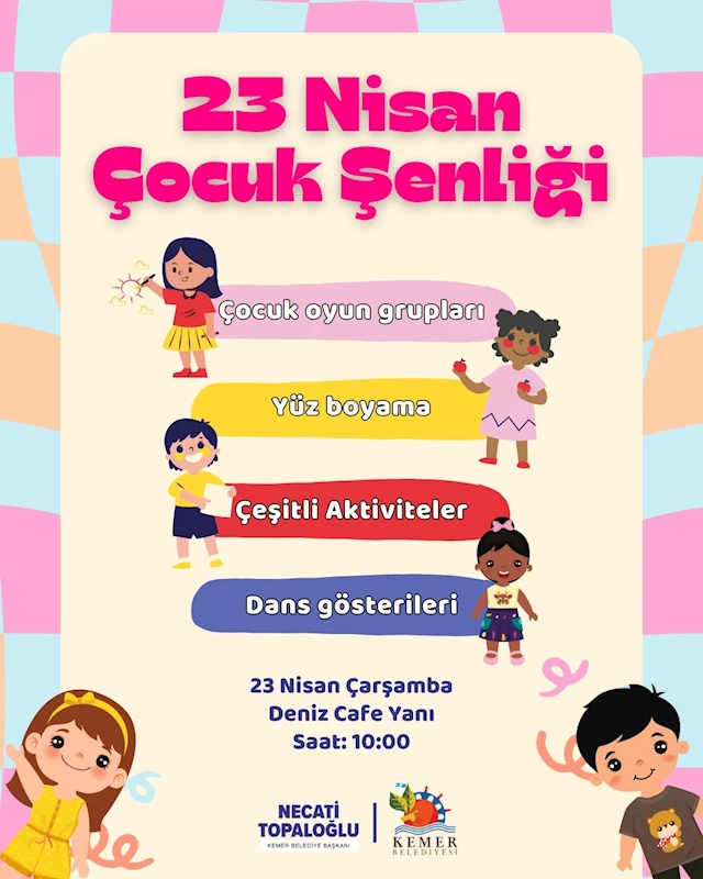 Kemer Belediyesi 23 Nisan Ulusal Egemenlik ve Çocuk Bayramı etkinlikleri kapsamında “23 Nisan Çocuk Şenliği” düzenleyecek.