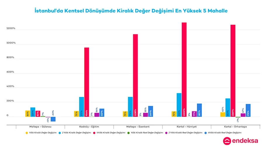 Pendik/Ertuğrulgazi Mahallesi: 1980’li yıllardan itibaren gecekondu yapımının yoğun olduğu Ertuğrulgazi mahallesi, Eylül 2022’de kentsel dönüşüm kapsamına alınmıştı. Aydos Ormanına ve Sabiha Gökçen Havalimanına da yakın konumuyla dikkat çeken Ertuğrulgazi Mahallesi, %1283’lik artışla, 4 yılda ortalama satılık konut değeri nominal olarak en fazla artan kentsel dönüşüm bölgesi. Satılık birim metrekare fiyatı 30 bin 851 TL/m2 olan mahallede, 2 yıllık satılık değer değişimi %148; yıllık satılık değer değişimi ise %31. 4 yıllık reel değer değişimi %178 olan Ertuğrulgazi’de satılık konut değerleri son bir yılda reel olarak %24 azalmış görünüyor.