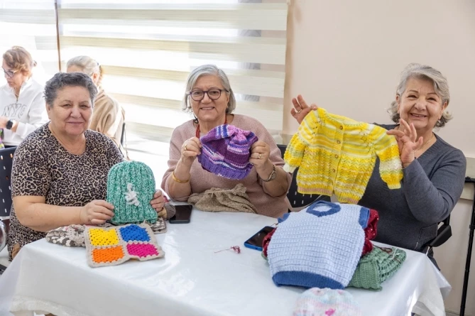 Konak Belediyesi’nin, İleri Yaş Sağlıklı Yaşam Merkezi kursiyerleri bu kış da örgüleriyle gönülleri ısıttı. Kazaktan battaniyeye, atkıdan çoraba el emeği örgü işleri, uzak köylerdeki çocuklara ulaştı; hem çocuklar hem yürekler ısındı.
