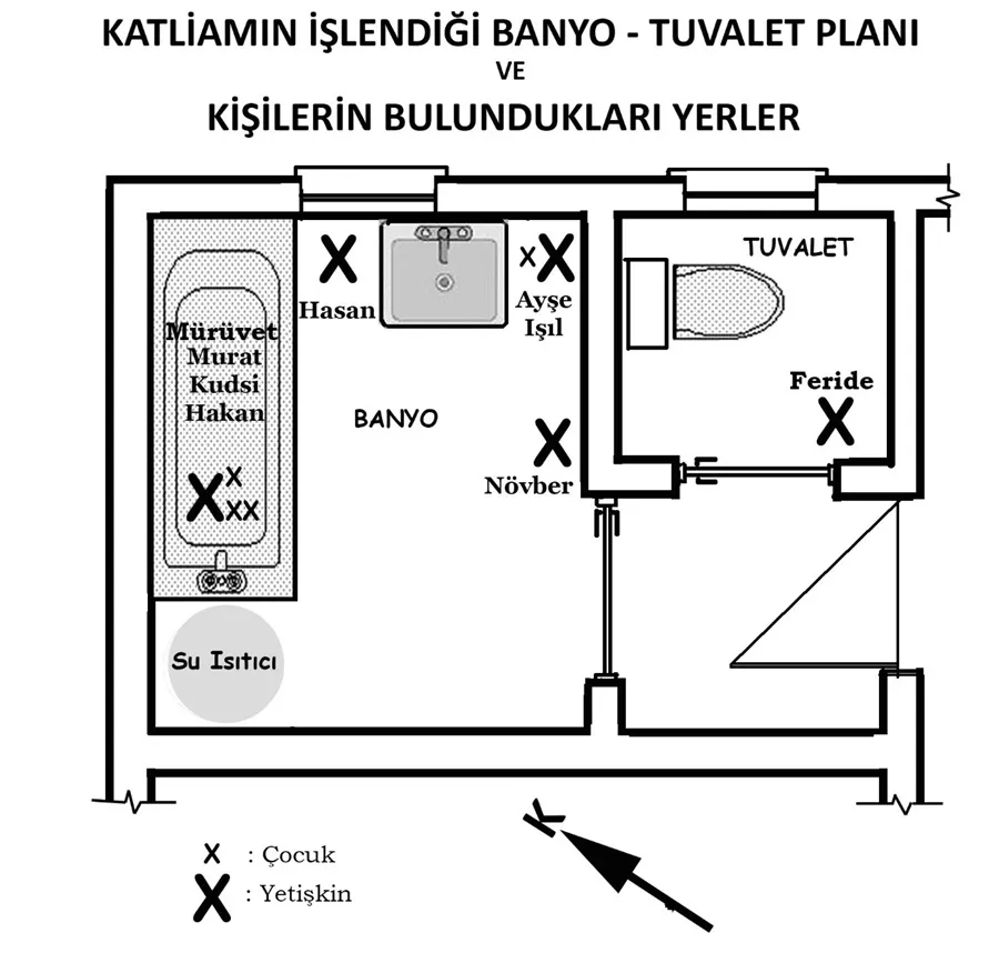 Ellerinde otomatik tüfek tutan iki cani, “Taksim istersiniz ha!” diye bağırarak her tarafa gelişi güzel ateş eder ve soldaki odaya çabucak göz attıktan sonra ileri seğirterek, önlerindeki kapıdan hole geçip soldaki yatak odasına yönelirler ve tekrar ateş etmeye başlarlar. İçlerindeki hınç önlerine çıkan her tür canlıyı öldürmelerini emrediyordu. Bu odada işleri bitince hızla önlerindeki ara kapıdan geçip, mutfağın önündeki hole gelirler ve soldaki ikinci yatak odasına da ateş ederler. Yataklara, yatak altlarına ve dolaplara.