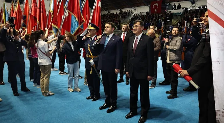 Saygı duruşu ve İstiklal Marşı'nın okunmasıyla başlayan törende, Vali Işın'ın günün anlam ve önemine ilişkin konuşmasının ardından öğrenciler tarafından şiirler okundu. Halk oyunları gösterisiyle renklenen tören, dereceye giren sporculara ödüllerinin verilmesi ve Tugay Bandosu'nun müzik dinletisiyle devam etti.