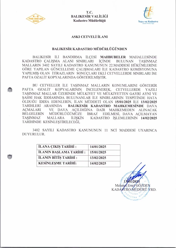 Bandırma İlçesi Mahbubeler Mahallesi sınırları içerisinde bulunan taşınmaz malların 3402 sayılı Kadastro Kanunun 22 inci maddesi kapsamında yapılan Kadastro güncelleme çalışmaları tamamlanarak kesin askı İlanı Cetveli ve Pafta Ozalitlerinin, 15.01.2025 ile 13.02.2025 tarihleri arasında müdürlüğünüzce ilan edilmesini ve askı ilan tutanağının tarafımıza gönderilmesini rica ederim.