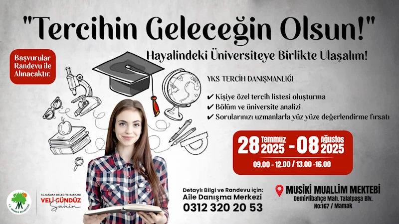 Mamak Belediyesi, üniversite hayali kuran gençler için Yükseköğretim Kurumları Sınavı (YKS) tercih döneminde önemli bir destek hizmeti sunuyor. 28 Temmuz – 8 Ağustos 2025 tarihleri arasında Musiki Muallim Mektebi’nde gerçekleştirilecek “YKS Tercih Danışmanlığı” hizmeti, randevu sistemiyle ve uzman isimlerin rehberliğinde yürütülecek.