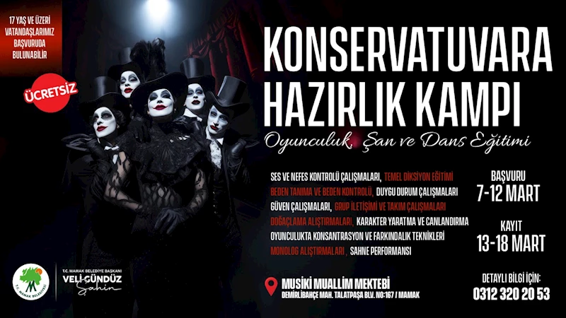 Mamak Belediyesi, 17 yaş ve üzeri vatandaşlar için ücretsiz "Konservatuvara Hazırlık Kampı" düzenliyor. Oyunculuk, şan ve dans eğitimlerinin verileceği kamp için başvurular 12 Mart’a kadar devam edecek.