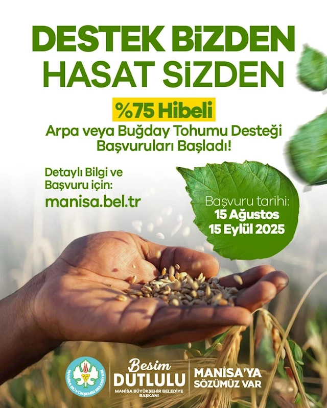 Manisa Büyükşehir Belediyesi, tarımsal üretimi artırmak ve çiftçilere destek olmak amacıyla yeni bir hibe programı başlattı. “Destek Bizden, Hasat Sizden” sloganıyla duyurulan program kapsamında ‘Arpa ve Buğday Tohumu’, ‘Beşli Karışım Yem Bitkisi Tohumu veya Süt Otu Tohumu’ ile NPK’lı Sıvı Organomineral Gübre ve Hayvansal Menşeli Aminoasit Desteği başvuruları başladı.