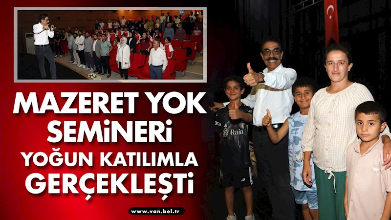 Van Hacıbekir Kültür Merkezi Konferans salonunda düzenlenen “Mazeret Yok” seminerinde bireysel gelişim, karakter inşası, toplumsal sorumluluk ve özgüven konularını ele aldı. Şaban Kızıldağ'ın interaktif ve dinamik anlatımıyla büyük beğeni toplayan program da çocuklar ve aileleri de sahneye davet edilerek çeşitli sorular soruldu.
