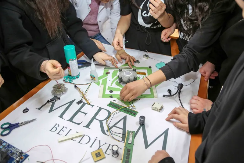 Eğitimde ayrıca geri dönüşüm süreçleri hakkında bilgi verilerek, kullanılmayan elektronik eşyaların çöpe atılmak yerine geri dönüşüme kazandırılmasının önemi vurgulandı. Programın dikkat çeken bölümü ise atölye çalışması oldu. Öğrenciler, toplanan elektronik atık parçalarını kullanarak Meram Belediyesi logosunu yeniden şekillendirdi. Kablolar, devre kartları, metal parçalar ve çeşitli elektronik bileşenlerden oluşturulan çalışma, geri dönüşümün üretken bir süreç olduğunu gösterdi.