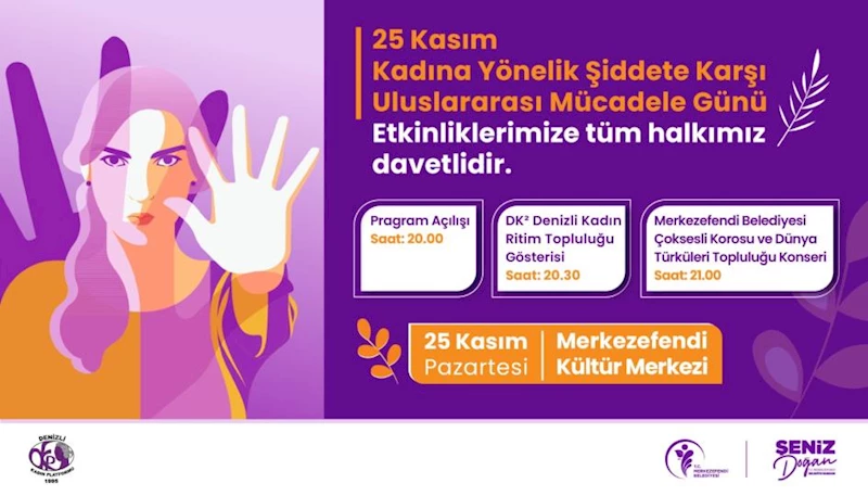 Özel gün ve haftalardaki hassasiyetini sürdüren Merkezefendi Belediyesi tarafından 25 Kasım Kadına Yönelik Şiddete Karşı Uluslararası Mücadele Günü’nde etkinlik düzenlenecek. Program, 25 Kasım Pazartesi günü saat 20.00’de Merkezefendi Kültür Merkezi’nde olacak. İlk olarak DK² Denizli Kadın Ritim Topluluğu sahne alarak performans sergileyecek. Ardından Merkezefendi Belediyesi Çoksesli Korosu ve Dünya Türküleri Topluluğu’nun birbirinden değerli eserleri seslendireceği konser başlayacak.