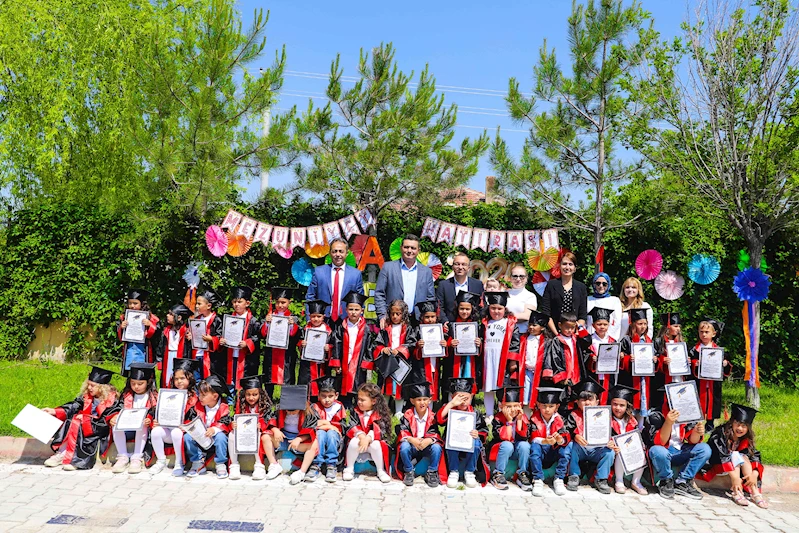 Mezuniyet töreninin sonunda minik öğrenciler ilk diplomalarını alarak kep atarak aileleriyle birlikte fotoğraf çektirdi.