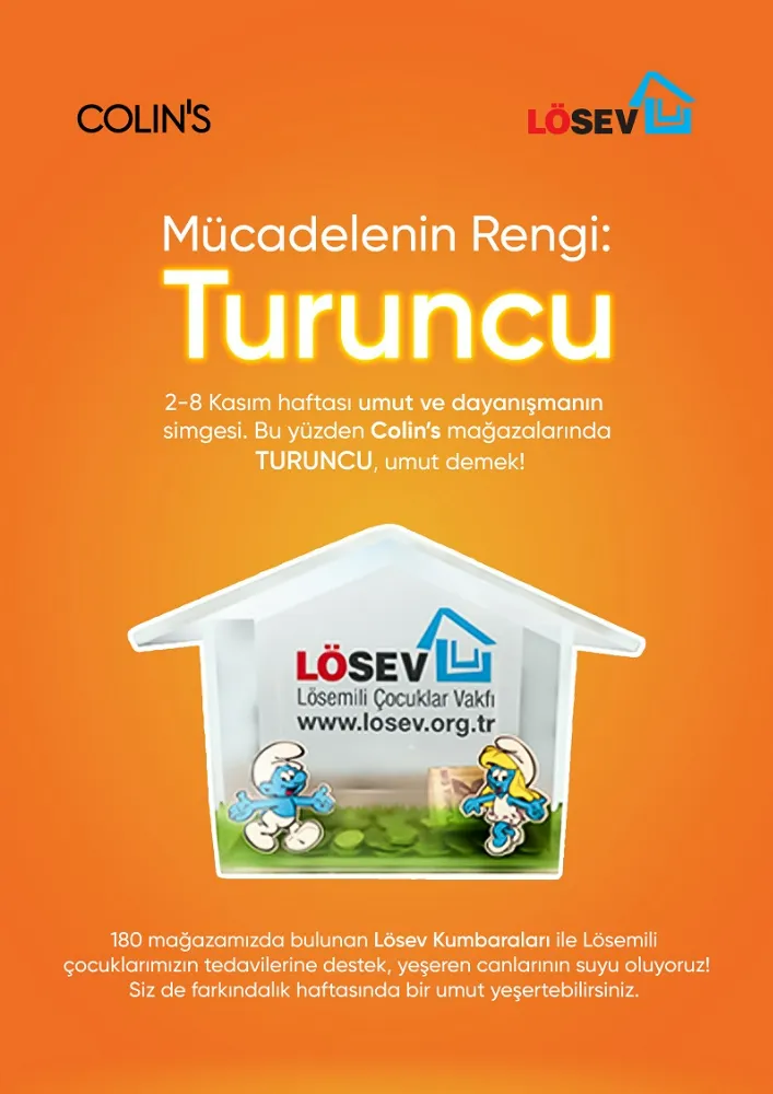 Lösemiyle mücadelenin simgesi olan turuncu rengine atıfta bulunarak “Mücadelenin Rengi: Turuncu” söylemiyle yayınladığı duyuru ile insanların LÖSEV'e destek verme fırsatını artırmayı hedefleyen Colin’s, herkesi bu harekete katılarak destek olmaya ve lösemili çocuklar ve aileleri için bir ışık olmaya çağırıyor.