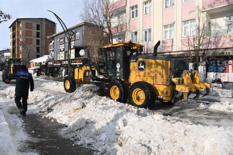 Muş Belediyesi ekipleri, kış şartları nedeniyle Muratpaşa ve Kültür mahallelerinde kar temizleme ve yükleme çalışmalarını aralıksız sürdürüyor.