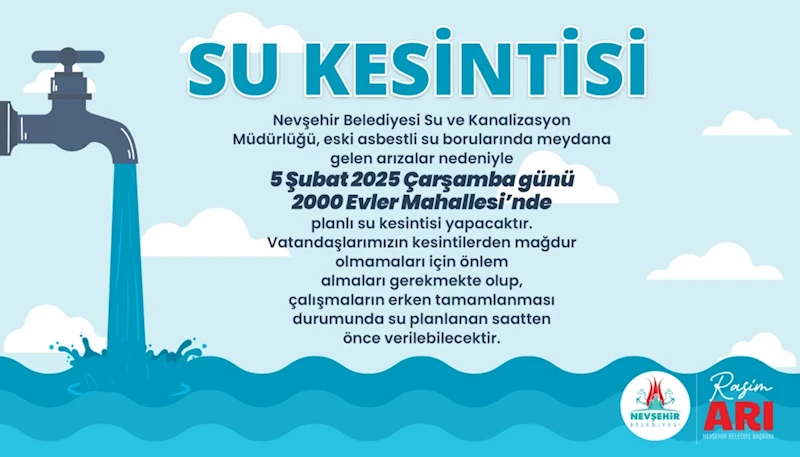 Nevşehir’in 2000 Evler Mahallesi’ndeki içme suyu şebeke hattında bulunan eski asbestli su borularında meydana gelen arıza dolayısıyla su verilemiyor. Belediye ekipleri arızanın en kısa sürede giderilmesi için çalışmalarını sürdürüyor.