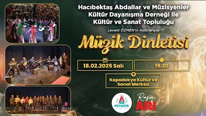 Hacıbektaş Abdallar ve Müzisyenler Kültür Dayanışma Derneği ile Kültür ve Sanat Topluluğu Levent Özmen'in katkılarıyla ücretsiz olarak düzenlenecek Müzik Dinletisinde 18 Şubat 2025 Salı akşamı saat 19:30’da türkü severler Kapadokya Kültür ve Sanat Merkezi’nde bir araya gelecek.
