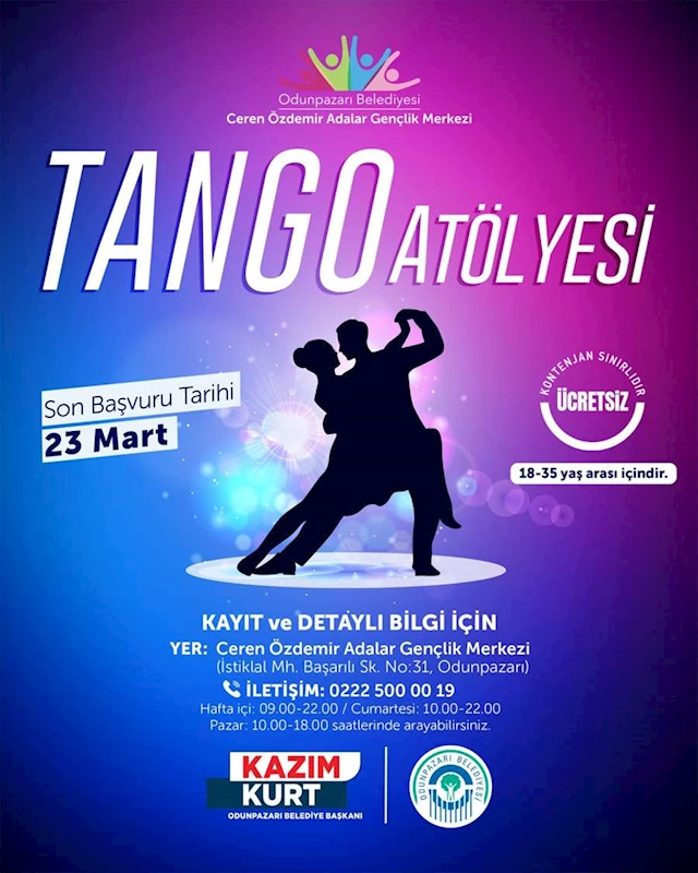 Tango tutkusunu deneyimlemek ve bu eşsiz dansın inceliklerini öğrenmek isteyenler için kayıt süreci başladı. Son başvuru tarihi 23 Mart olan atölyeye katılmak isteyenler, Ceren Özdemir Adalar Gençlik Merkezi’nin 0222 500 00 19 numaralı telefonu arayarak kayıt yaptırabilirler.