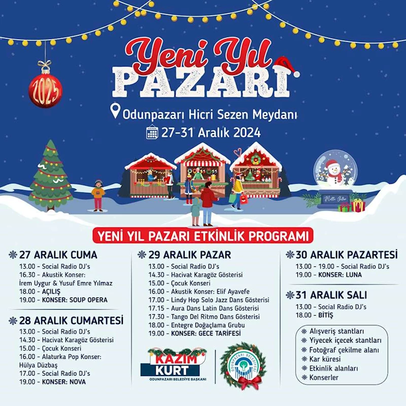 Odunpazarı Belediyesi, 27-31 Aralık 2024 tarihleri arasında Hicri Sezen Meydanı'nda düzenlenecek olan "Yeni Yıl Pazarı" etkinlikleriyle Eskişehir halkını yeni yıl coşkusuna davet ediyor. Beş gün boyunca devam edecek bu etkinliklerde konserler, gösteriler ve çocuklara özel aktiviteler yer alacak.