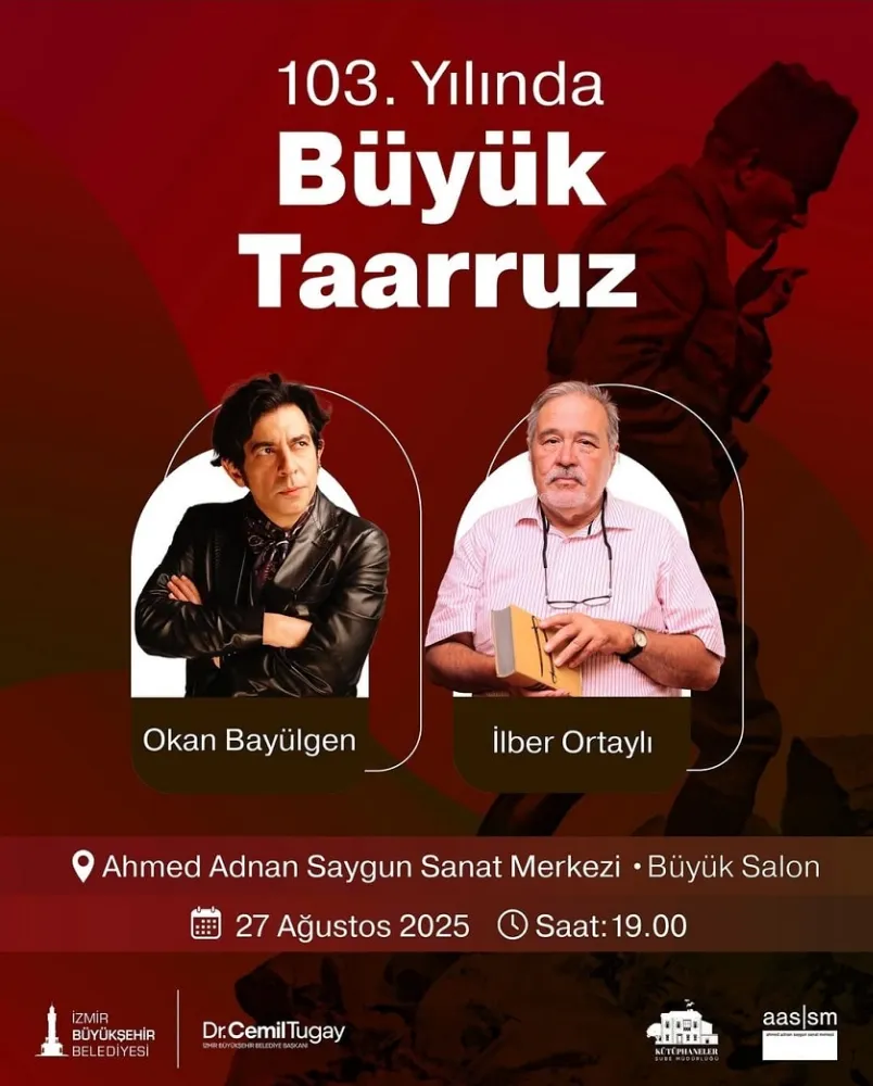 İzmir Büyükşehir Belediyesi, Okan Bayülgen ve Prof. Dr. İlber Ortaylı’yı “Büyük Taarruz ve Cumhuriyet’in Kurucu Ruhuna Yolculuk” adlı söyleşi ile İzmirliler ile bir araya getiriyor. Etkinlik, 27 Ağustos’ta Ahmed Adnan Saygun Sanat Merkezi’nde saat 19.00’da yapılacak.