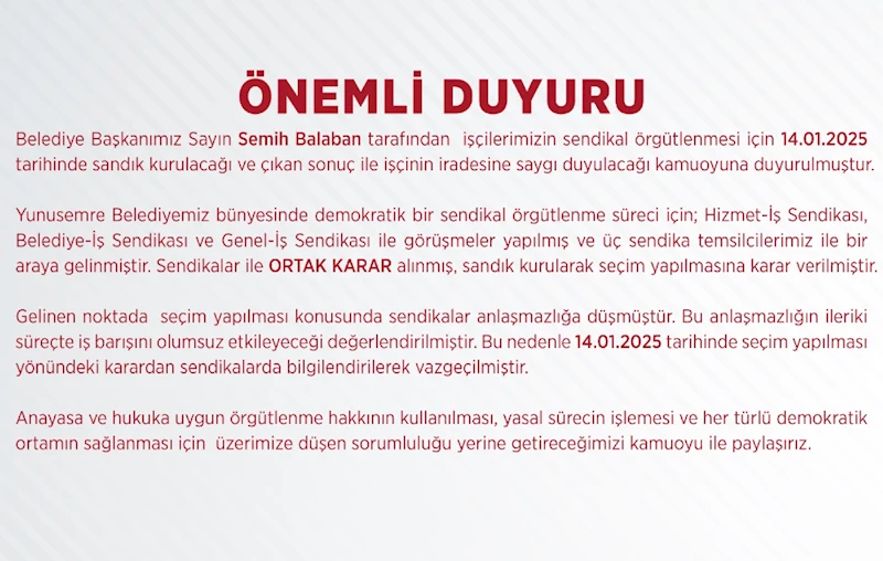 Yunusemre Belediye Başkanımız Sayın Semih Balaban tarafından işçilerimizin sendikal örgütlenmesi için 14.01.2025 tarihinde sandık kurulacağı ve çıkan sonuç ile işçinin iradesine saygı duyulacağı kamuoyuna duyurulmuştur. Yunusemre Belediyemiz bünyesinde demokratik bir sendikal örgütlenme süreci için; Hizmet-İş Sendikası, Belediye-İş Sendikası ve Genel-İş Sendikası ile görüşmeler yapılmış ve üç sendika temsilcilerimiz ile bir araya gelinmiştir. Sendikalar ile ORTAK KARAR alınmış, sandık kurularak seçim yapılmasına karar verilmiştir. Gelinen noktada seçim yapılması konusunda sendikalar anlaşmazlığa düşmüştür. Bu anlaşmazlığın ileriki süreçte iş barışını olumsuz etkileyeceği değerlendirilmiştir. Bu nedenle 14.01.2025 tarihinde seçim yapılması yönündeki karardan sendikalarda bilgilendirilerek vazgeçilmiştir. Anayasa ve hukuka uygun örgütlenme hakkının kullanılması, yasal sürecin işlemesi ve her türlü demokratik ortamın sağlanması için üzerimize düşen sorumluluğu yerine getireceğimizi kamuoyu ile paylaşırız.