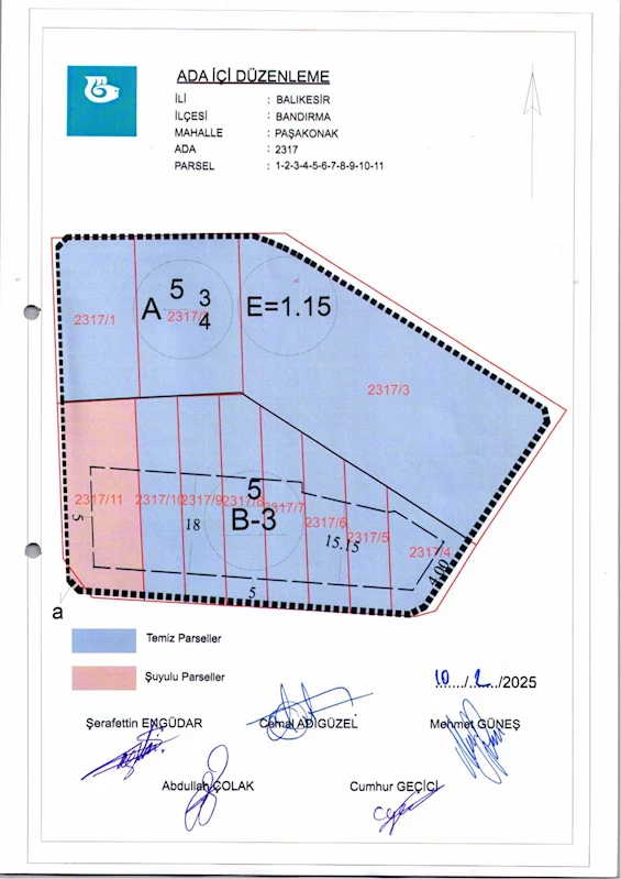 Belediye Encümeninin 12.02.2025 tarih ve 113 sayılı Encümen kararı ile Paşakonak Mahallesi, 2317 ada 1-2-3-4-5-6-7-8-9-10-11 nolu parsellere ait ada içi düzenlemesinin, 1/1000 ölçekli Bandırma Uygulama İmar Planı notlarının 137. Maddesi ve 3194 sayılı İmar Kanununun 19. maddesi gereği onaylanmasına,