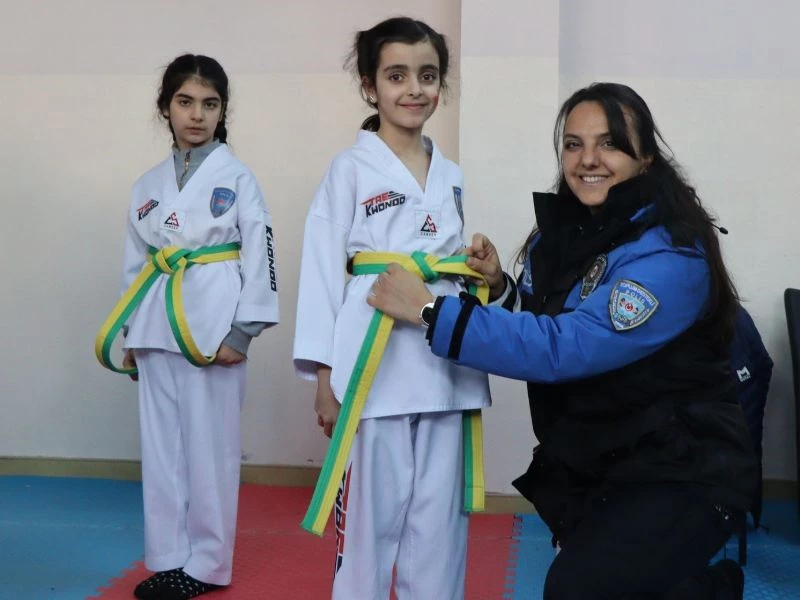 Erzurum’da tekvando kursunu başarı ile bitiren öğrencilerin kuşaklarını polisler bağladı.