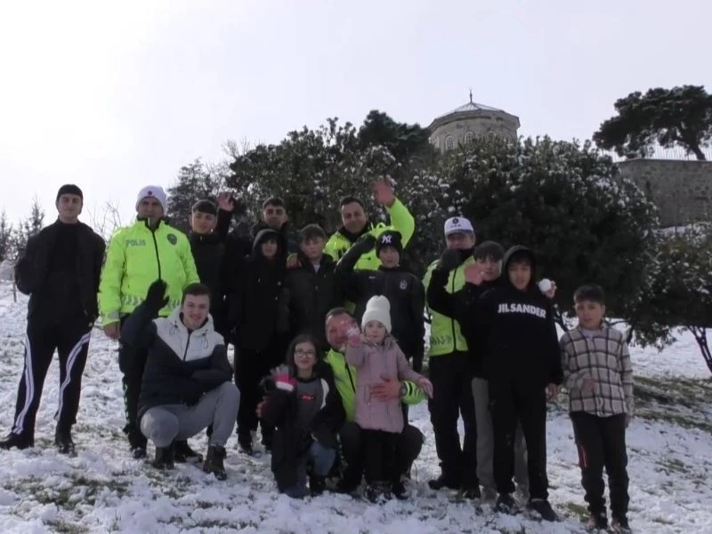 Trabzon Emniyet Müdürlüğü bağlı ekipler, kar yağışı ile beyaza bürünen kentte çocuklarla kar topu oynadı.