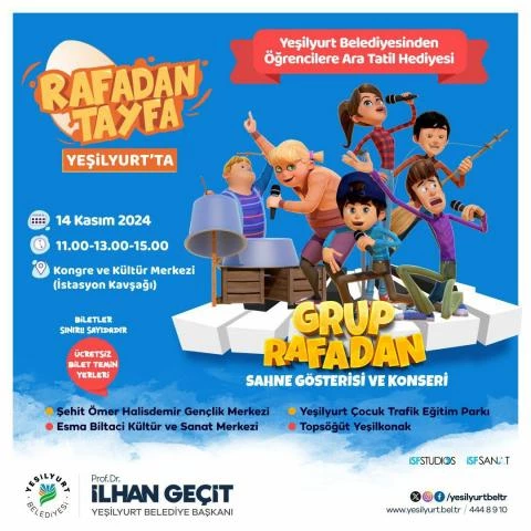 Yeşilyurt Belediyesi, çocukların sosyal, fiziksel ve zihinsel gelişimlerine katkı sunan hizmetlerine bir yenisini daha ekleyecek. 2024-2025 Yılı Eğitim-Öğretim Döneminde verilen ara tatil döneminde çocukları unutmayan Yeşilyurt Belediyesi, ‘Rafadan Tayfa’ müzikal tiyatro gösterisine ev sahipliği yapacak.