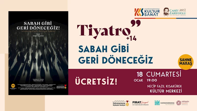 Necip Fazıl Kısakürek Kültür Merkezi’nde 18 Ocak Cumartesi günü saat 19.00’da sahnelenecek oyun, 14 yaş ve üzeri izleyiciler için uygun olarak planlandı. “Sabah Gibi Geri Döneceğiz” adlı oyun, tiyatronun birleştirici gücünü topluma ulaştırmayı hedefliyor. Ücretsiz olarak sahnelenecek gösteriye 14 yaş ve üzeri tüm vatandaşlar davet edildi.