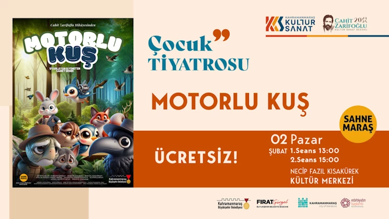 Büyükşehir Belediyesi, yarıyıl tatilinin son günü olan 2 Şubat Pazar günü NFK Kültür Merkezi’nde “Motorlu Kuş” adlı tiyatro gösterisini çocuklarla buluşturacak. Sahne Maraş Tiyatro Okulu tarafından sahnelenecek gösteri, çocuklara unutulmaz bir gün yaşatacak.
