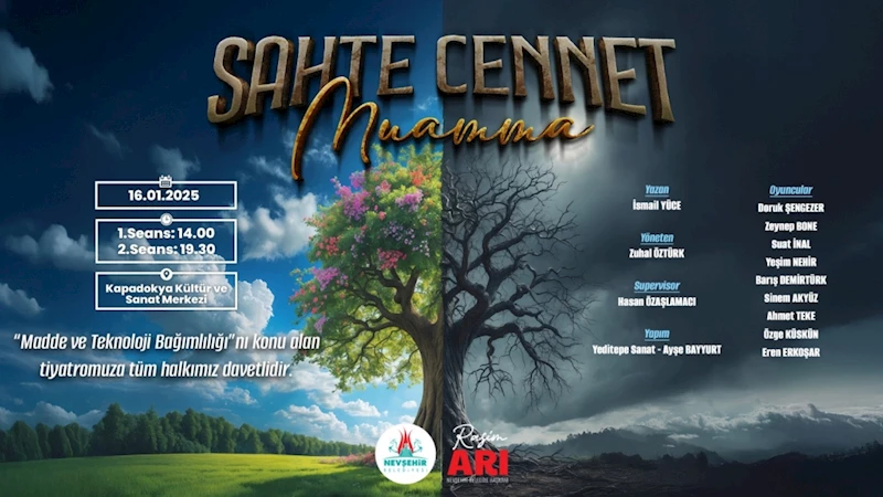 “Sahte Cennet- Muamma” adlı tiyatro gösterisi 16 Ocak 2025 Perşembe günü Nevşehir Belediyesi Kapadokya Kültür ve Sanat Merkezinde izleyiciyle buluşacak.