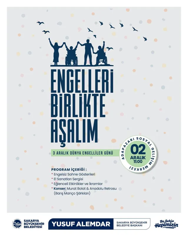 Sakarya Büyükşehir Belediyesi, 3 Aralık Dünya Engelliler Günü kapsamında bir etkinlik organize ediyor. Sosyal Hizmetler Dairesi Başkanlığı Engelli Hizmetleri Şube Müdürlüğü tarafından düzenlenen program, "Engelleri Birlikte Aşalım" sloganıyla 2 Aralık Salı günü saat 11.00'da Sosyal Gelişim Merkezi'nde (SGM) başlayacak.