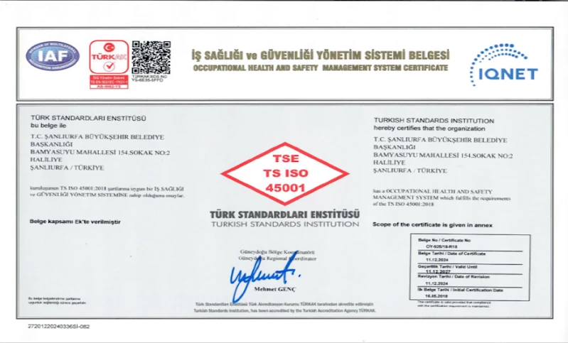 Şanlıurfa Büyükşehir Belediyesi'nin sahip olduğu 'Müşteri Memnuniyeti Yönetim Sistemi', 'İş Sağlığı ve Güvenliği Yönetim Sistemi', 'Kalite Yönetim Sistemi' ve 'Enerji Yönetim Sistemi' belgeleri, Türk Standartları Enstitüsü (TSE) tarafından başarıyla yenilendi.