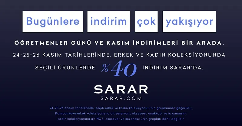 80 yıldır kaliteli ve şık ürünleri ile hazır giyim sektörünü kalkındıran Sarar, Türkiye'nin geleceğini yetiştiren öğretmenlerin anlamlı gününü, ‘Kasım İndirimleri’ ile birleştirerek özel bir kampanya ile kutluyor. 24-25-26 Kasım tarihlerinde Sarar mağazalarında ve sarar.com’da yapılacak alışverişlerde anında %40 indirim uygulanıyor.