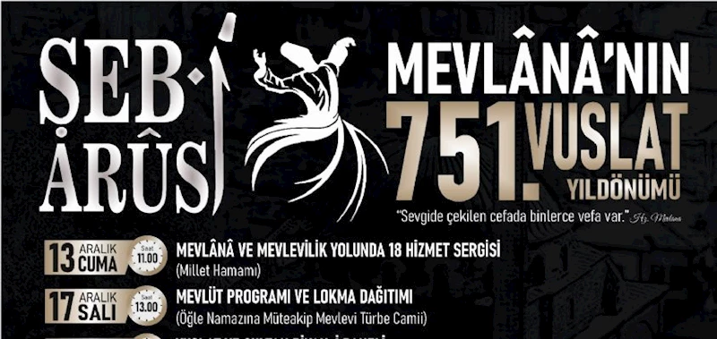 Şeb-i Arûs etkinlikleri, 13 Aralık Cuma günü “Mevlânâ ve Mevlevîlik Yolunda 18 Hizmet Sergisi” ile başlayacak. Millet Hamamı’nda gerçekleşecek sergi, Hz. Mevlânâ’nın öğretilerini yansıtan eserleri vatandaşlarımızla buluşturacak.